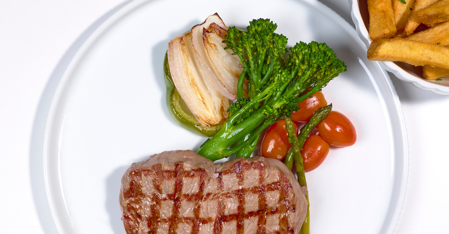 Tomatsauce, Fior de latte ost, oksemørbrad, blandede skovsvampe, grøn peber & cherry tomater
